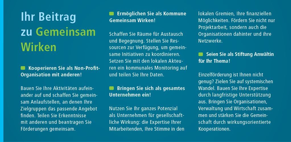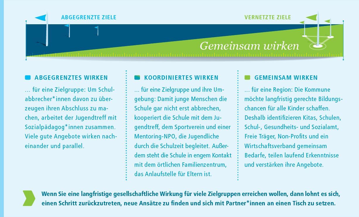 Einen Jugendlichen bis zum Berufseinstieg begleiten, den gesellschaftlichen Zusammenhalt vor Ort fördern oder die Erdüberhitzung aufhalten – manche Herausforderungen sind so komplex, dass eine NPO, eine Stiftung, eine Kommune oder ein Unternehmen alleine sie unmöglich lösen kann. Sie erfordern Gemeinsam Wirken, also das gemeinsame Handeln vieler.