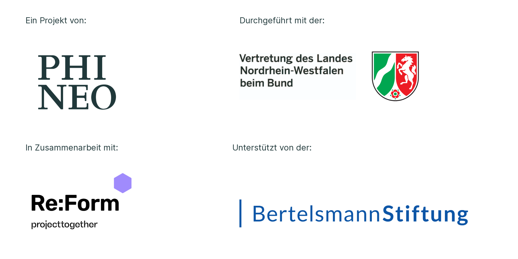 Die Impact Kommunen Konferenz ist Teil des gleichnamigen Projektes Impact Kommunen von PHINEO Public. Das Projekt wird unterstützt von der Bertelsmann Stiftung und in Zusammenarbeit mit Re:Form, ProjectTogether umgesetzt.